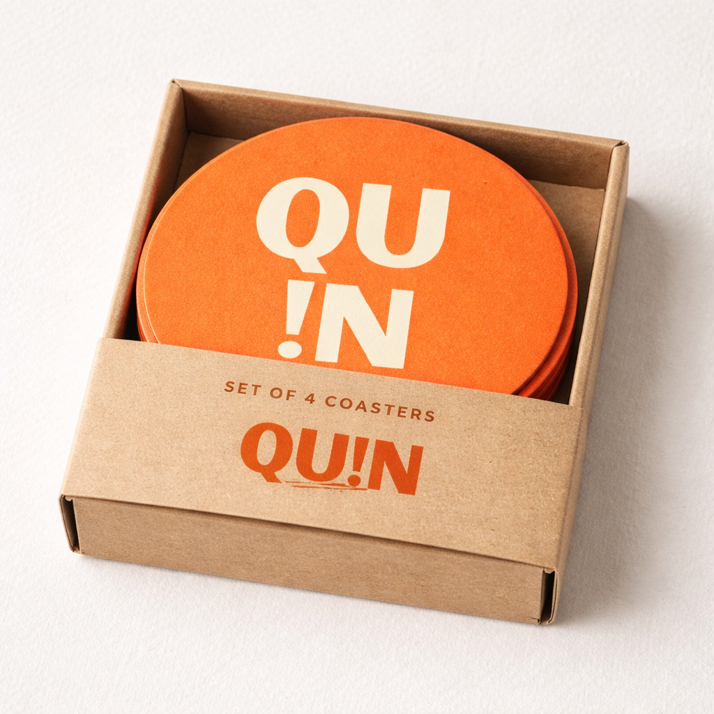 El pack de posavasos QUIN traslada la identidad de la marca al espacio donde ocurre el momento. Cuatro piezas minimalistas en color naranja, con el logotipo QUIN como único elemento gráfico, pensadas para acompañar el vino sin distraerlo.